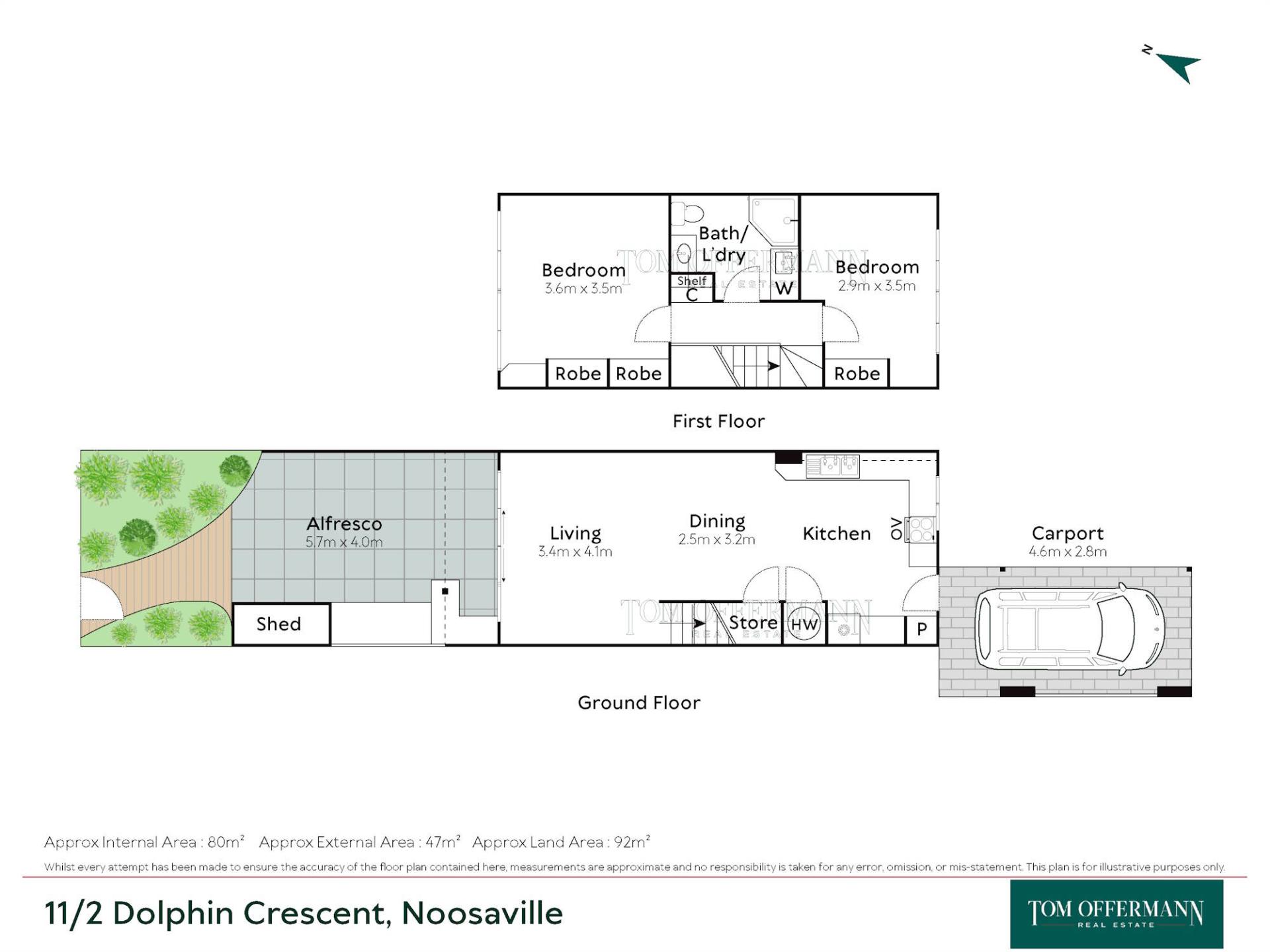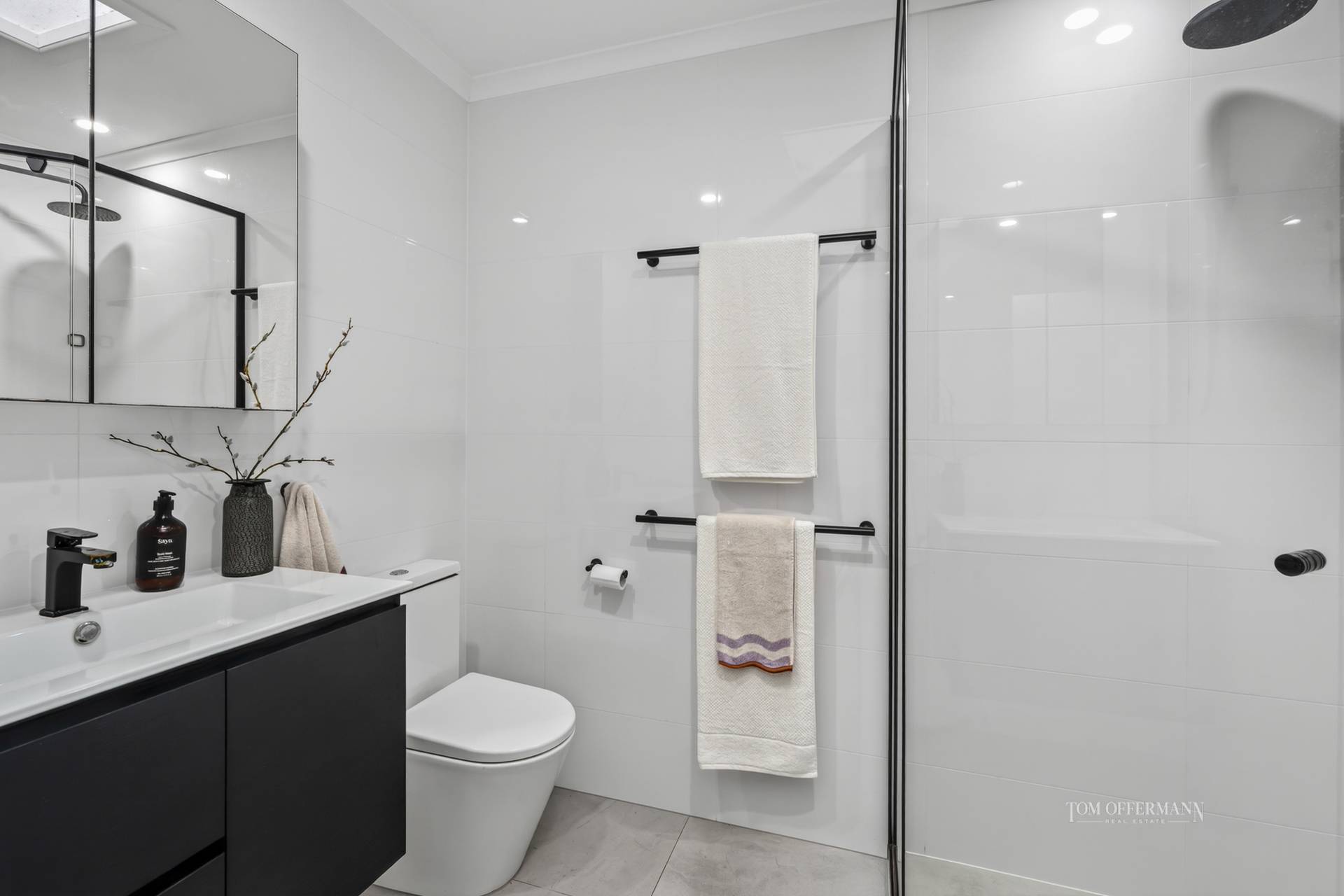 Accommodation is thoughtfully positioned on the upper level, where two beautifully appointed bedrooms with built-in robes are serviced by a central bathroom with integrated laundry, delivering both comfort and functionality.