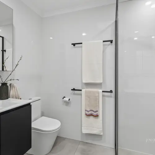 At the heart of the home, the sleek L-shaped kitchen combines form and function with expansive stone-look benchtops, a tiled splashback and quality appliances, while direct access to the single carport ensures everyday ease. The overall aesthetic is one of relaxed luxury, light, airy and intuitively connected.