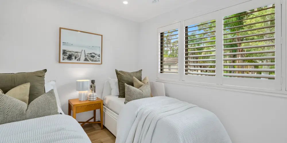 A curated palette of contemporary finishes is enhanced by plantation shutters, ceiling fans throughout and clever under-stair storage, reinforcing the home's considered design.