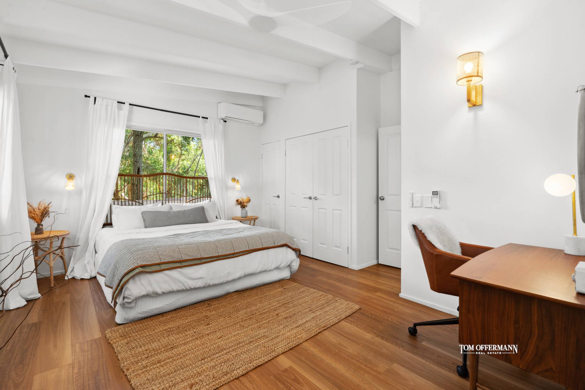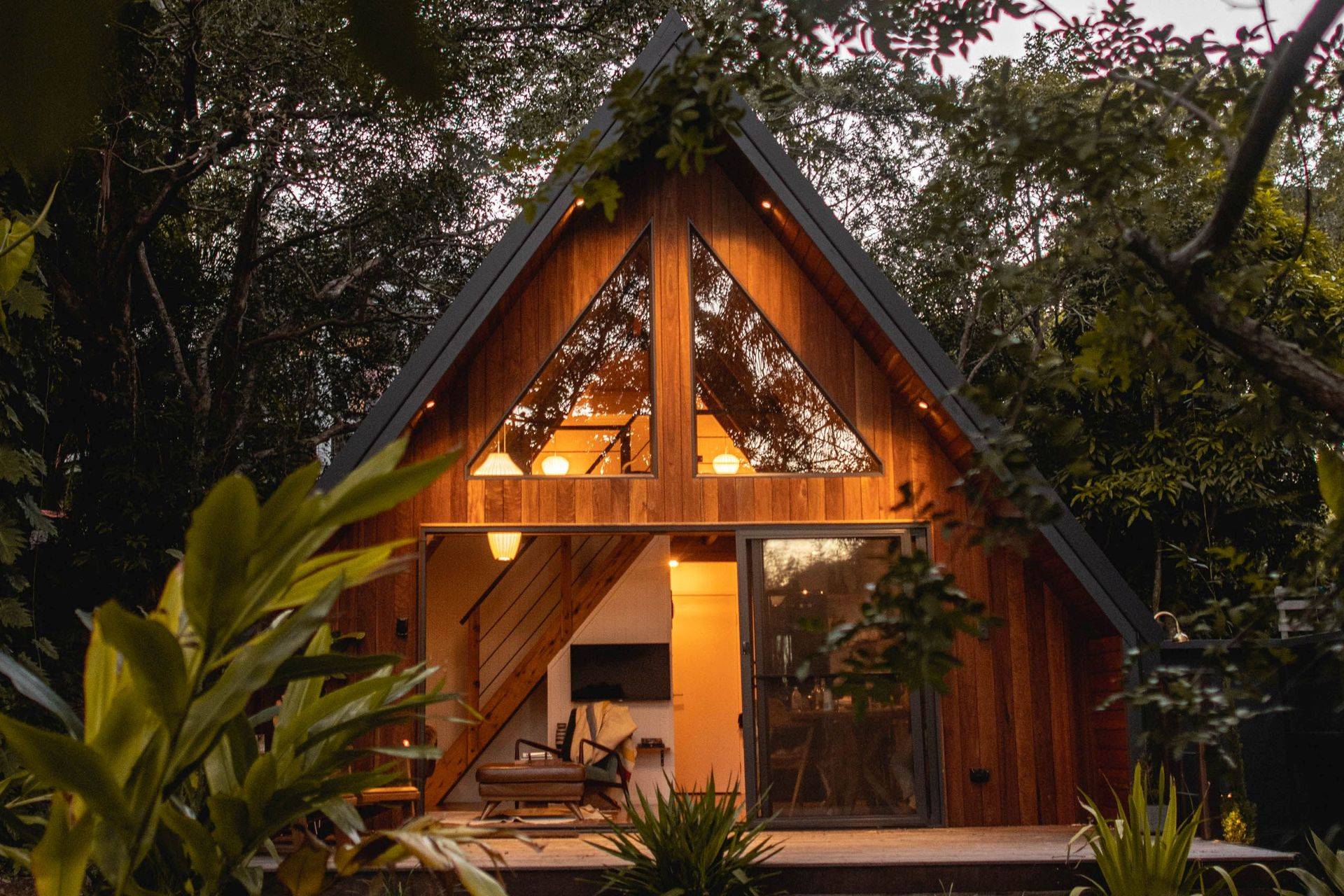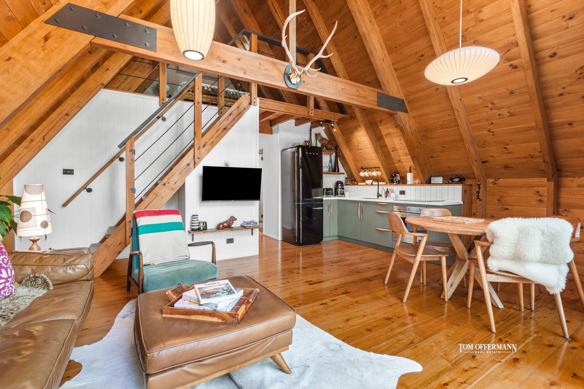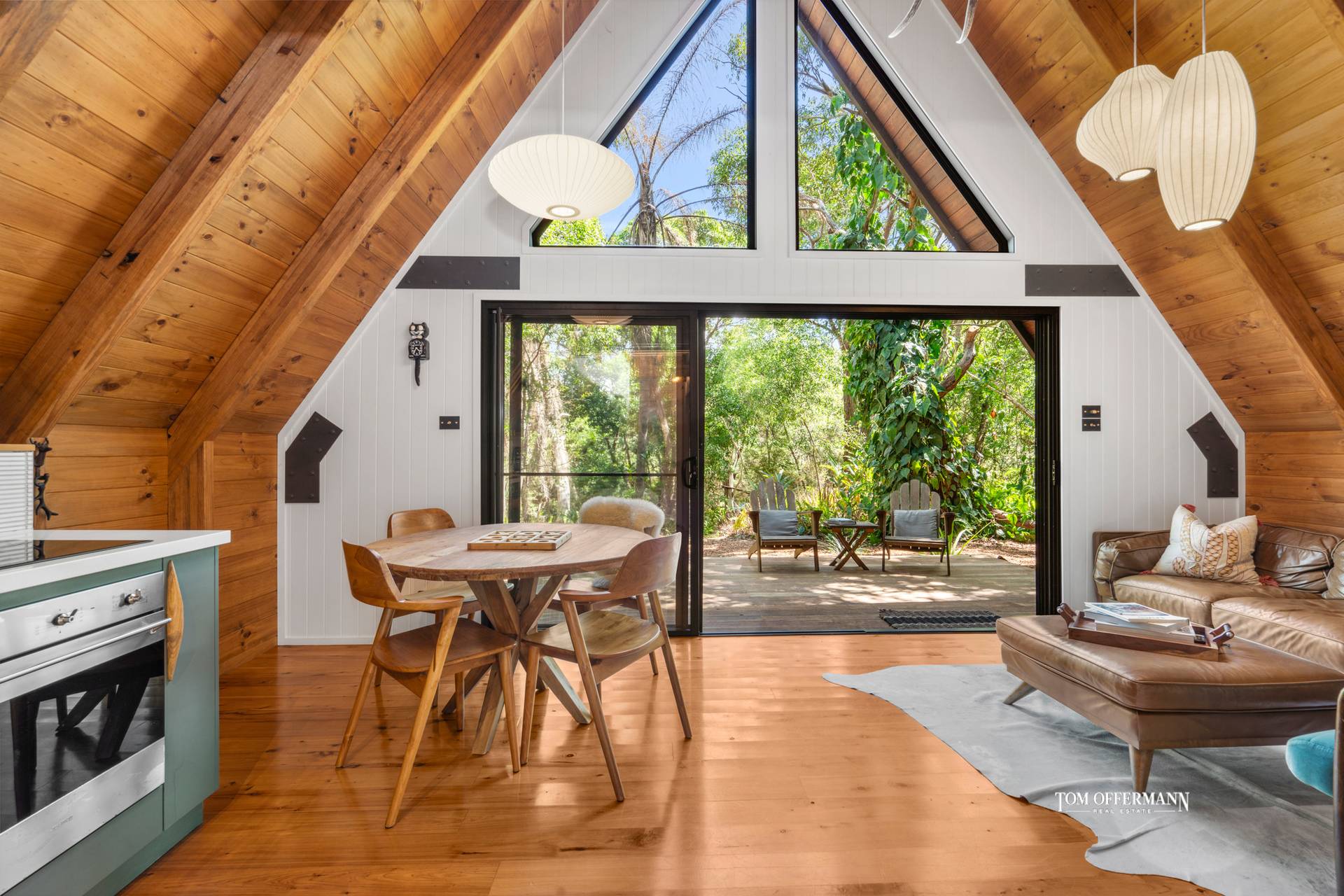 Dwelling #2: Eh Frame is chocolate box cuteness along the pathway almost hugging the Noosa National Park. The new Canadian-inspired mid-century A-frame has exposed timber beams, and vintage finds part of the unique decor in the open plan living and dining spaces, which open out to a terrace, a wonderful place to have a morning cuppa and commune with nature. The kitchen boasts premium appliances, the bedroom has a built-in robe, the modern bathroom is adjacent, and upstairs is a multi-use loft space. Resident koalas are in the trees and there's a pathway access from doorstep to the Noosa National Park and Alexandria Bay. What a perfect and unique holiday alternative.