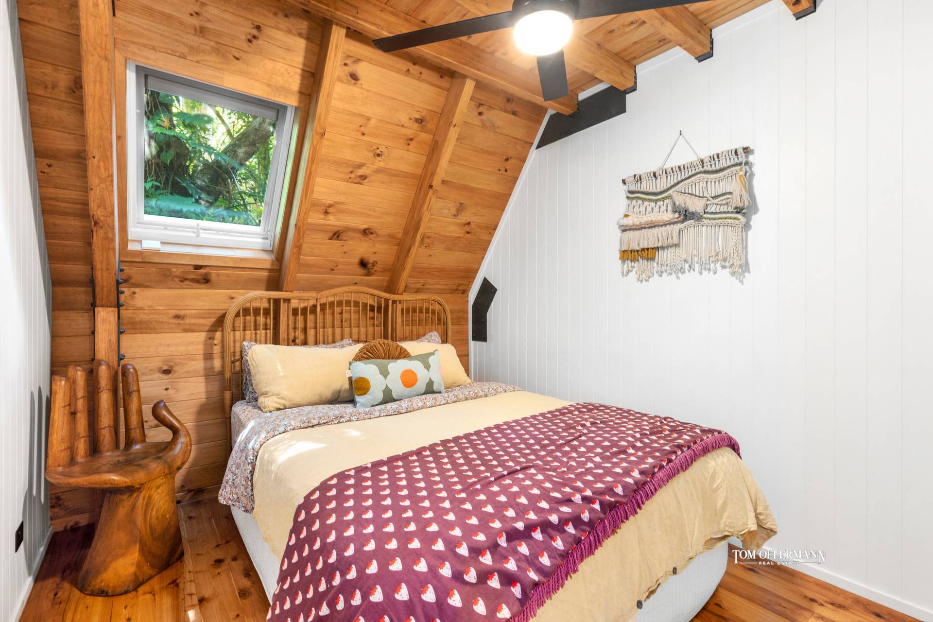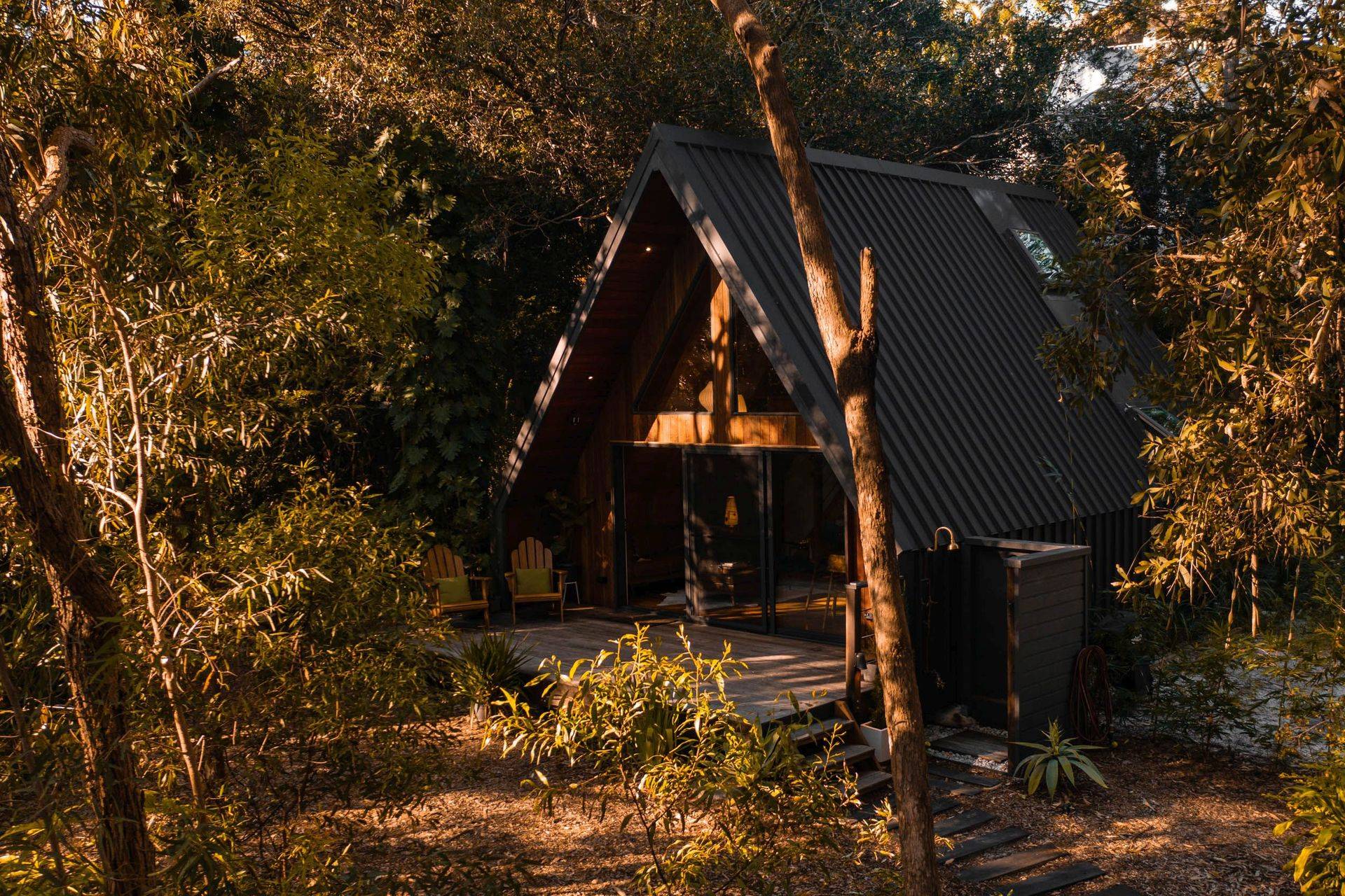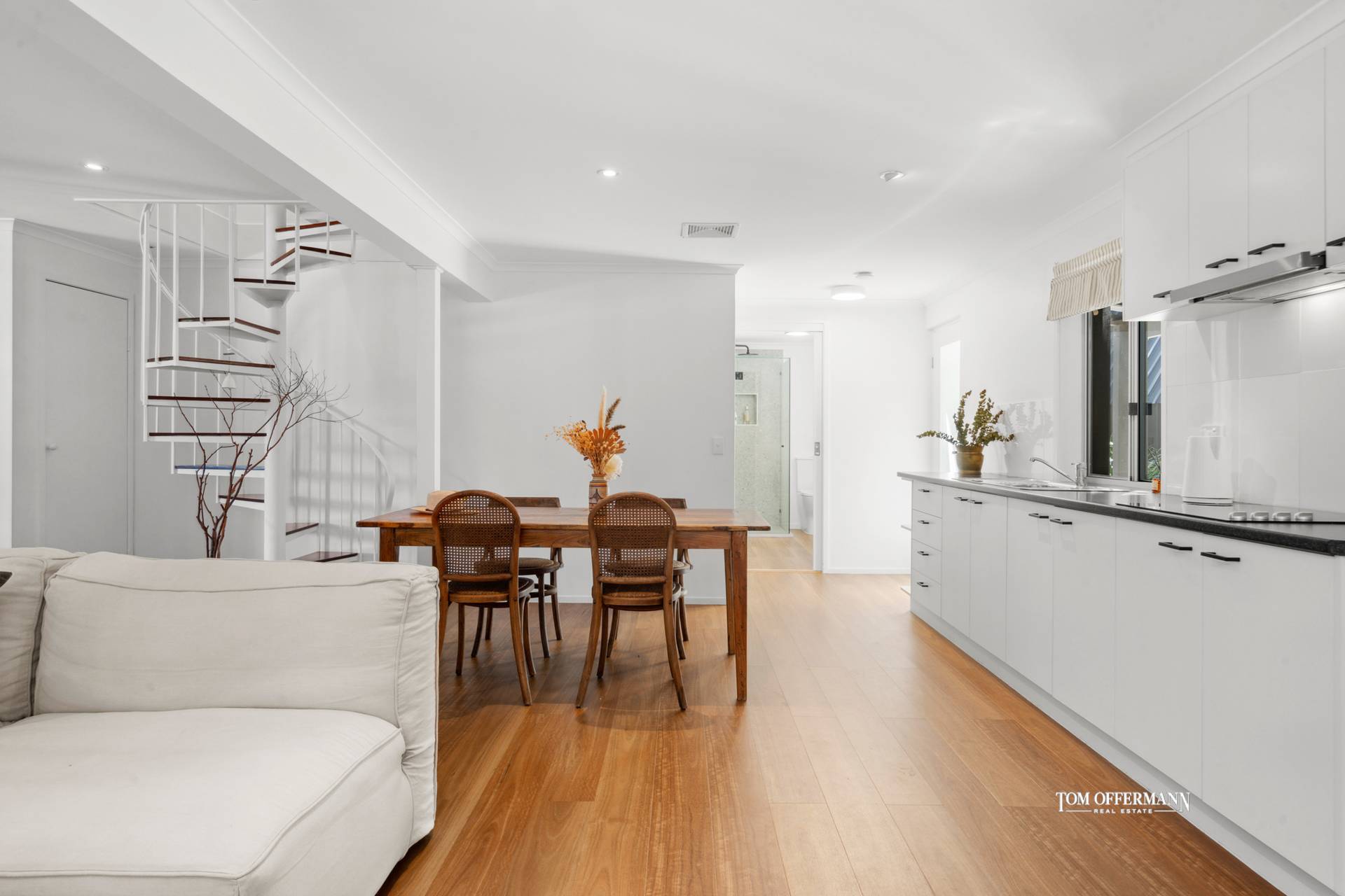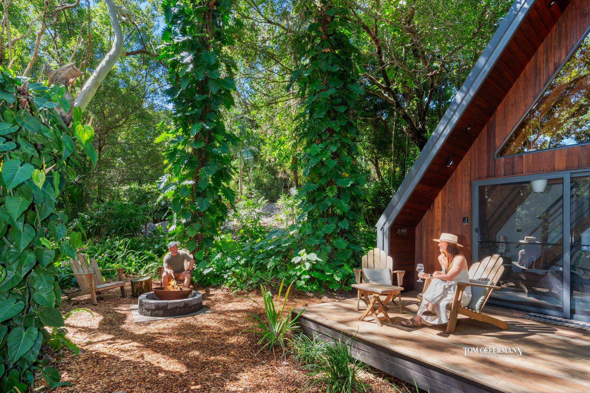 Dwelling #2: Eh Frame is chocolate box cuteness along the pathway almost hugging the Noosa National Park. The new Canadian-inspired mid-century A-frame has exposed timber beams, and vintage finds part of the unique decor in the open plan living and dining spaces, which open out to a terrace, a wonderful place to have a morning cuppa and commune with nature. The kitchen boasts premium appliances, the bedroom has a built-in robe, the modern bathroom is adjacent, and upstairs is a multi-use loft space. Resident koalas are in the trees and there's a pathway access from doorstep to the Noosa National Park and Alexandria Bay. What a perfect and unique holiday alternative.