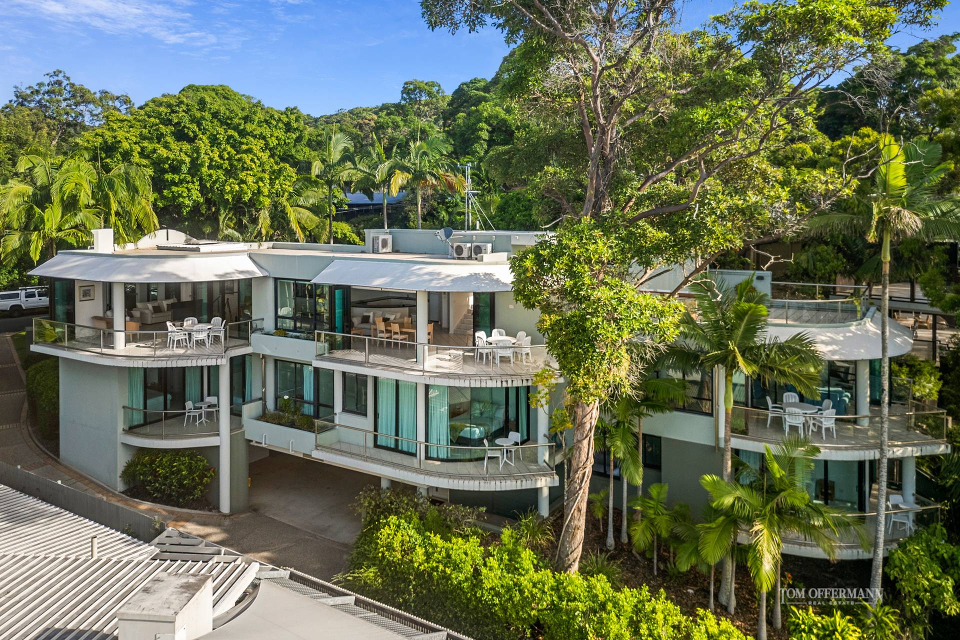 From the lush streetscape, the substantial sage-hued residence embraces nearly the full width of the larger-than-most 885m2 land, is almost shrouded in stands of tropical palms and a driveway which parallels the easement, leads to the garages. Look up and admire all the terraces on each level of the numerous living areas, also the Noosa National Park surrounds, where local fauna including koalas, goannas, kookaburras, and lorikeets often call home.
